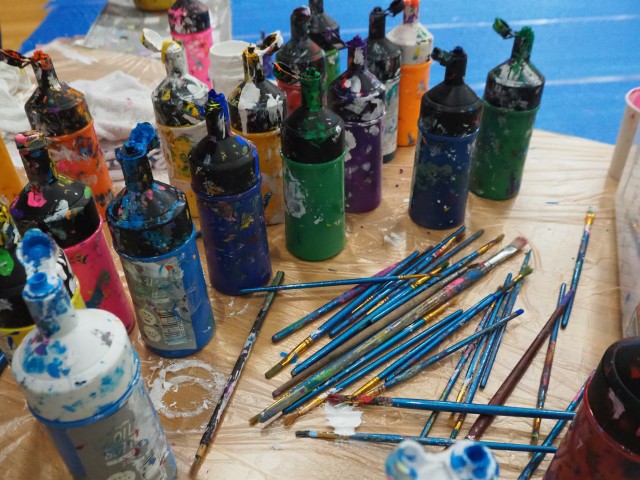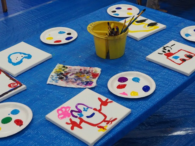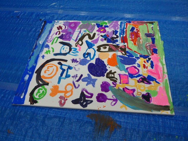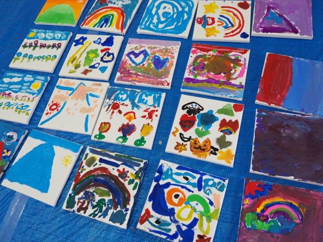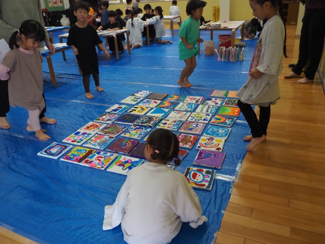 年長組は【東京都すくわくプログラム】に参加しました。講師の先生から身近にある石を組み合わせて花を作りアクリル絵の具で色をつける活動を教えて頂きました。できた花は花壇に飾りました。 |